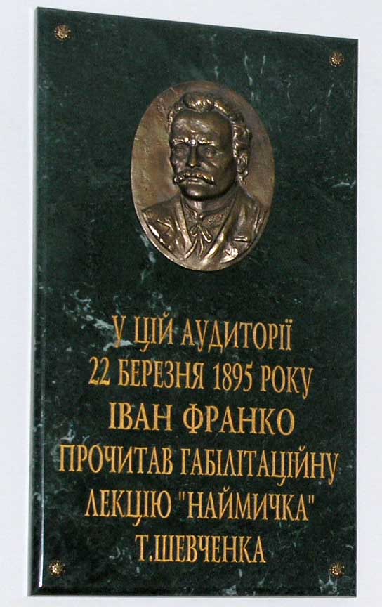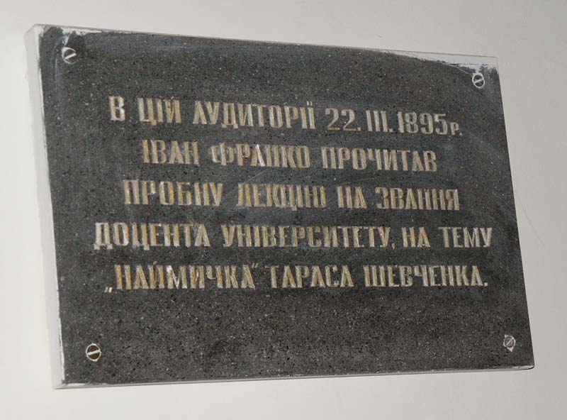 | Планується встановлення меморіальної таблиці і відновлення тогочасного інтер’єру в аудиторії № 244, де Іван Франко виголосив габілітаційну лекцію (навчальний корпус на вул. М.Грушевського, 4). (Із переліку плану заходів Львівського національного університету імені Івана Франка з нагоди святкування 150-річчя від дня народження Івана Франка, які затверджено на засіданні Вченої Ради 29 жовтня 2003 року) |