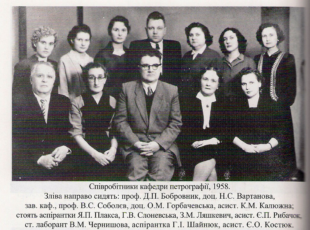 З 1950 р. при кафедрі діє між кафедральна лабораторія літологічних досліджень. Протягом майже 20 років на кафедрі готували фахівців петрографів для зарубіжних країн (В’єтнам, Куба, Лаос, Монголія, НДР, Сирія). Навчальний процес забезпечували професори В.С. Соболев, Д.П. Бобровник, О.П. Бобрієвич, К.І. Свєшніков, доценти Н.С. Вартанова, О.М. Горбачевська, Ю.П. Дорошенко, І.Н. Кривошлик, Є.І. Лавренко, І.В. Побережська, А.Ю. Сеньковський, Є.М. Сливко, В.Б. Степанов, Ю.І. Федоришин, В.О. Хмелівський, асистенти К.М. Калюжна, О.В. Костюк, В.П. Поповчак, Є.П. Рибачок та інші. Інженерно – технічний персонал О.А. Бура, І.Г. Гнатів, Л.Д. Зубкова, І.В. Попова, В.В. Онишко, В.М. Чернишова, Ю.В. Сидор та ін.