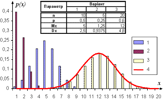 Рис. 4.1. Біноміальний закон розподілу 1, 2, 3 та нормальне наближення 4.