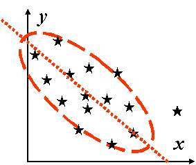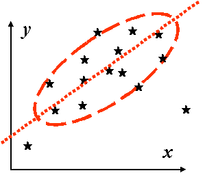 а б Рис. 3.1. Візуальна оцінка характеру кореляційного зв’язку за кореляційним полем: а – пряма кореляція, r > 0; б – зворотна кореляція, r < 0.