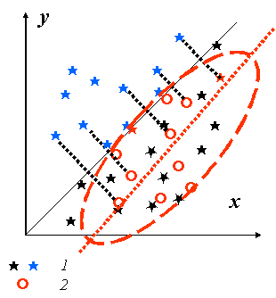 Для прямої кореляції характерною тенденцією є збільшення одного з параметрів, якщо збільшується інший, а для оберненої, навпаки: збільшення одного супроводжується, як звичайно, зменшенням іншого. Причиною фіктивної кореляції (тобто такої, що спостережена, але не властива природним об’єктам) може бути неоднорідність сукупності даних, які відображають два різні об’єкти (рис. 3.2). Іноді методика дослідження впливає на створення видимості зв’язку там, де його немає. Наприклад, якщо вимірювати довжину і ширину без урахування орієнтації зразків, то всі точки кореляційного поля лежатимуть у секторі від 0 до 45° (замість сектора 0–90°), що помилково можна сприйняти як наявність деякого зв’язку (рис. 3.3).