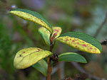 Листья очередные, плотные, кожистые, зимующие, длиной 5-27 мм. Обрат-нояйцевидные
