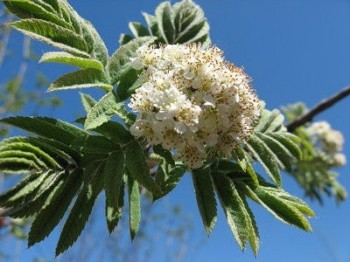 Цветет рябина в мае — июне белыми цветками, собранными в большие щитовидные