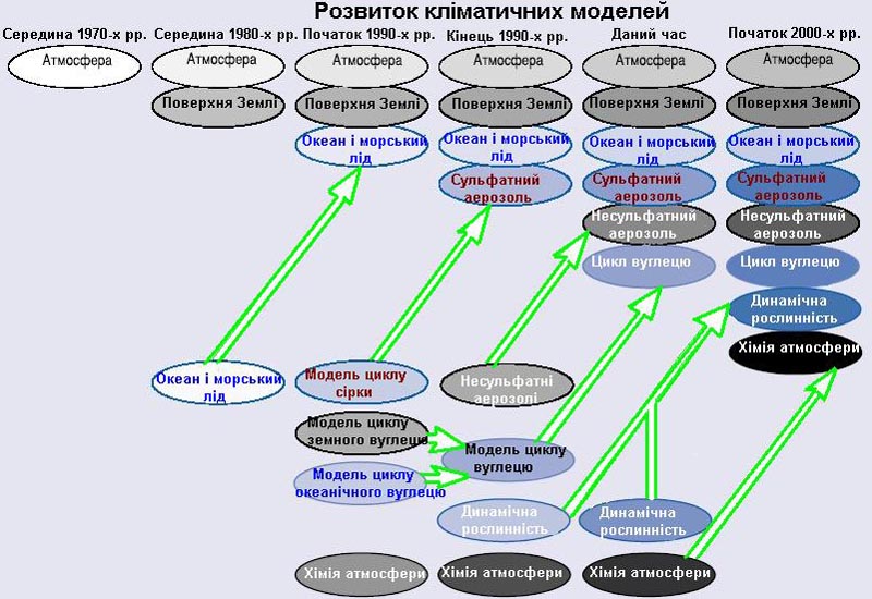 а потім поступово інтегровані, моделі основних компонентів, атмосфери,