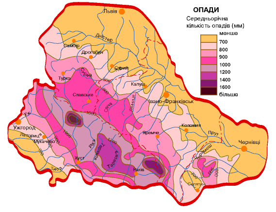 сума опадів зростає тут до 800 мм, а в Закарпатті - до 1000 мм.