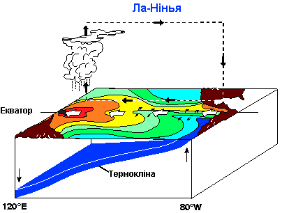 що називається Ла-Нінья (дитя-дівчинка по-іспанськи), коли східна частина Тихого океану охолоджується.