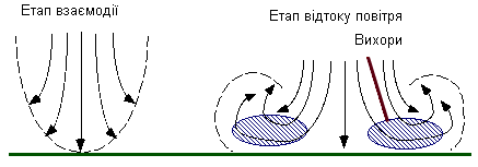 Спочатку мікросплеск розвивається як спадний рух повітря, що починається з основи хмари. Цей спадний потік прискорюється й у межах декількох хвилин досягає землі (етап взаємодії). Саме протягом цього етапу спостерігаються найдужчі вітри. Потім випливає етап відтоку вітру, у плині якого вихори вітру піднімають холодне повітря ладь від крапки взаємодії з землею. Протягом пружного етапу, вітри продовжують прискорювати повітря, представляючи велику загрозу для авіації. |