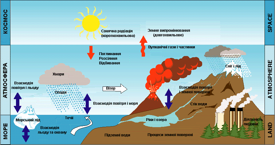 • Вплив фізичних процесів в оболонках Землі на клімат суші і моря.
