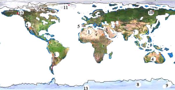 Місця екстремальних кліматичних факторів на земній поверхні. (1-6 позначено максимальні, а 7-13 мінімальні значення температури).